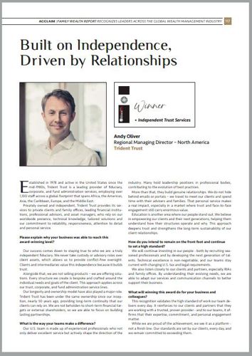Construida con Independencia, Impulsada por Relaciones 01/07/2025 Mientras celebrábamos nuestra reciente victoria en los premios 2025 North America Family Wealth Report Awards, nuestro Director General Regional para Norteamérica, Andy Oliver, habló con los editores de la revista sobre los valores que nos distinguen: nuestra independencia, nuestro enfoque centrado en el cliente y nuestro compromiso a largo plazo.Destacó el papel fundamental que desempeñan nuestros equipos a la hora de establecer relaciones de confianza, ofrecer soluciones a medida y dar forma a las normas del sector, así como nuestra inversión continua en personal e innovación para impulsar el futuro de nuestro negocio. X Linkedin weixin Messenger Autores Andy Oliver Director de Estrategia del Grupo y Director General Regional, Norteamérica [email protected] +44 20 7935 1503 Reino Unido Más Clientes Privados Noticias Conozca a nuestro equipo de clientes privados de América en ACTEC y el LatAm Private Wealth Forum 30/09/2022 Chipre Introducirá una Prueba Adicional de Residencia Fiscal para las Empresas 24/01/2022 Actualización sobre la sustancia económica de las Islas Caimán 13/08/2020 Últimas Noticias Trident Trust amplía su oferta de servicios a España Introducción de las Normas de Servicios Financieros (Servicios Compartidos Globales) 2022 Conozca a nuestro equipo de GAIM Ops en Gran Caimán Introducción del impuesto de sociedades en los EAU Trident Trust amplía su presencia de servicios de fondos en EE.UU. a Texas Registro británico de entidades extranjeras, ¡Se acerca la fecha límite!