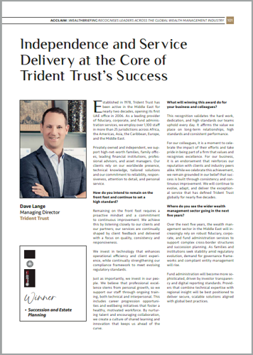 Celebrating Success and Shaping the Future: Insights from Trident Trust’s Dubai Leadership 06/01/2026 Celebrating our success at the 2025 WealthBriefing MENA Awards, our Dubai Managing Director, Dave Lange, shares insights on what keeps Trident Trust ahead of the curve. From listening to clients and investing in technology to strengthening compliance and nurturing talent, Dave explains how a proactive mindset and continuous improvement underpin our approach. He also reflects on what this recognition means for our teams and offers a forward-looking view on the evolving wealth management landscape in the Middle East. Read the full interview below. X Linkedin weixin Messenger Authors Dave Lange Managing Director & Senior Executive Officer [email protected] +971 4 277 1191 Dubai More Private Clients News Meet Our Americas Private Client Team at ACTEC and the LatAm Private Wealth Forum 30/09/2022 Cyprus to Introduce an Additional Corporate Tax Residency Test 24/01/2022 Cayman Islands Economic Substance Update 13/08/2020 Latest News Trident Trust Expands Service Offering to Spain Introduction of the Financial Services (Global Shared Services) Rules 2022 Meet Our Team at GAIM Ops in Grand Cayman Introduction of UAE Corporate Income Tax Trident Trust Extends US Fund Services Footprint to Texas UK Register of Overseas Entities, Deadline Approaching!